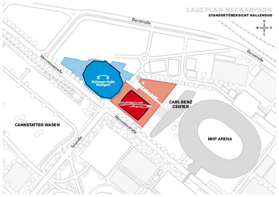 Die Hanns-Martin-Schleyer-Halle und die Porsche-Arena befinden sich in unmittelbarer Nähe der Mercedes-Benz Arena und sind bestens an den öffentlichen Personennahverkehr (ÖPNV) angeschlossen. Dazu gehören die beiden S-Bahn-Stationen „Bahnhof Bad Cannstatt“ und „NeckarPark (Mercedes-Benz)“. Die U-Bahn-Station und die Bushaltestelle „NeckarPark (Stadion)“ befinden sich in unmittelbarer Nähe zum Haupteingang des Hallenduos.