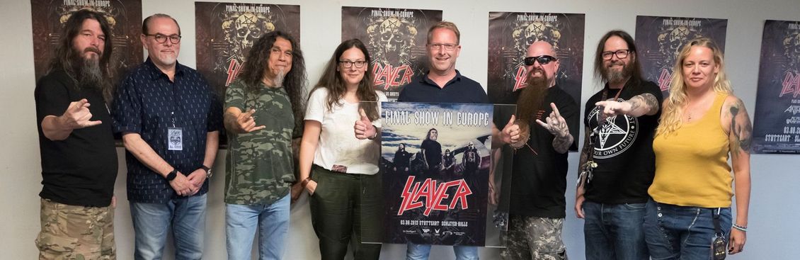 Eine bemerkenswerte Leistung, die mit der Übergabe des „Sonder-Awards“ durch René Otterbein, Abteilungsleiter des Hallenduos im NeckarPark, geehrt wurde. „Es ist wirklich überwältigend, dass Slayer sich bei uns von ihren Fans verabschiedet. Das ist ein grandioses Finale und wird den Metal-Fans lange in Erinnerung bleiben“, sagt René Otterbein. Bei der Verleihung waren mit dabei: Paul Bostaph, Rick Sales (Slayer Manager), Tom Araya, Sibylle Stumpp (Vaddi Concerts), René, Kerry King, Gary Holt, Julia Frank (Wizard Promotions).