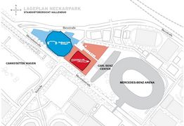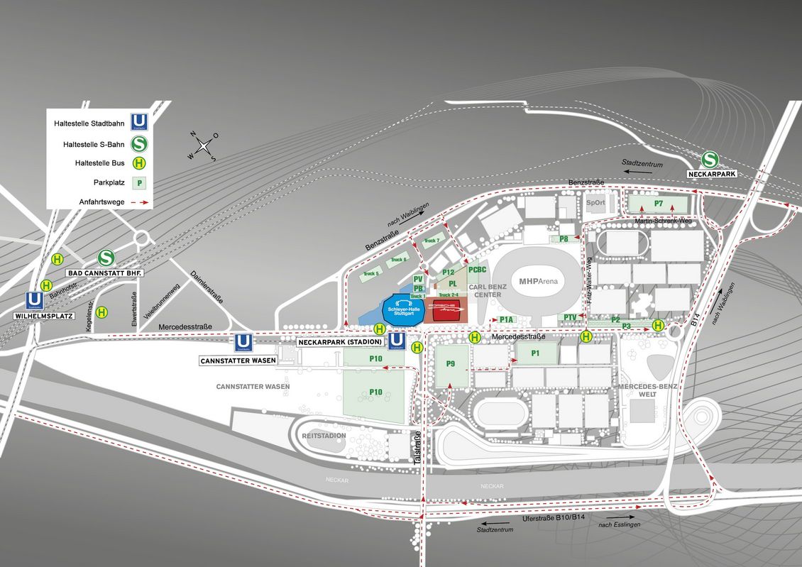 Die Hanns-Martin-Schleyer-Halle und die Porsche-Arena befinden sich in unmittelbarer Nähe der Mercedes-Benz Arena und sind bestens an den öffentlichen Personennahverkehr (ÖPNV) angeschlossen. Dazu gehören die beiden S-Bahn-Stationen „Bahnhof Bad Cannstatt“ und „NeckarPark (Mercedes-Benz)“. Die U-Bahn-Station und die Bushaltestelle „NeckarPark (Stadion)“ befinden sich in unmittelbarer Nähe zum Haupteingang des Hallenduos.